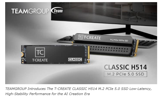 Team Group Inc. has introduced the T-CREATE CLASSIC H514 M.2 PCIe 5.0 SSD to address demand for data storage in the generative AI era. Built on the PCIe Gen5 x4 interface, the SSD delivers up to 14,200 MB/s read and 13,300 MB/s write speeds. The data transfer supports access to large creative assets and workloads such as video editing, image processing, visual effects, and 3D modeling. It also supports workflows for local AI model inference and training.